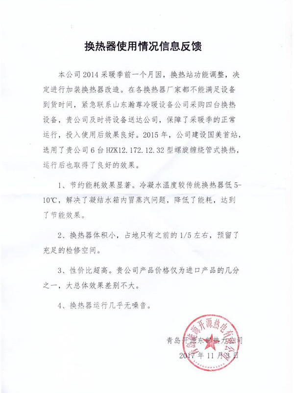 • 山東瀚尊冷暖設備有限公司坐落在美麗的齊國古都---淄博,是一家以換熱(冷凝)產品研發、生產、營銷為一體的企業;自2008年以來,通過與中外知名熱力設備制造商合作以及自主探索和創新,于2010年成功研制生產出了公司第一臺螺旋纏繞管式換熱器;同時,公司依托自身強大的技術力量和研發能力,于2016年成功研制生產無死角無菌級雙管板式換熱器,近年來,公司努力走在中國換熱器行業的前列,致力于創造民族品牌,為用戶提供專業技術支持與服務......